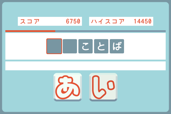 ひらがなの「あ」か「い」を入れて単語を完成させるゲームです。連続正解ボーナスやノーヒントボーナスあり!制限時間以内にできるだけたくさん正解して目指せハイスコア!